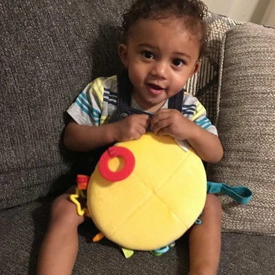 - Features vibrant colors, textures and patterns with 11 different elements to discover including a crinkly knot, plastic teething ring, rattling rings and a variety of loops and tags with different shapes, colors and textures.