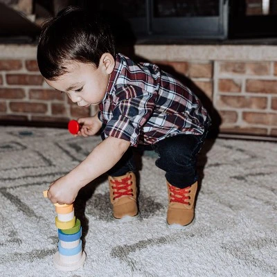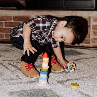 - This colorful wooden stacking toy has a wobbly curved base to make stacking more fun as children learn about balancing and gravity.