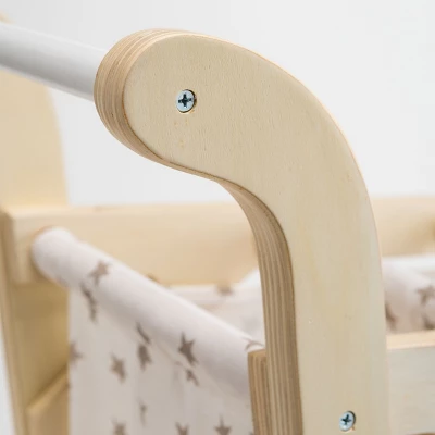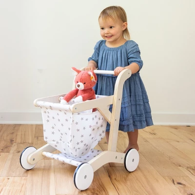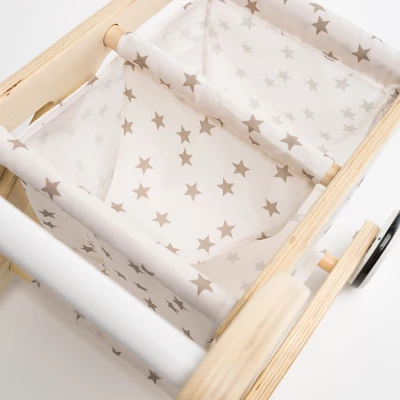 Pretend-shop or carry dolls and plush pals to important events! Our Wooden Shopping Cart with Rolling Wheels is made of the natural materials that kids and parents adore, including a sturdy, laminated wood frame with a lower shelf, a cloth basket, and wheels that really roll. The wooden wheels are painted white and finished with a strip of PVC to protect floors. The white fabric basket is printed with a scattering of pretty gold stars. All shopping carts should be this inviting! Basket cloth is removable for machine washing; spot clean cart frame with soap and water. Simple adult assembly is required.