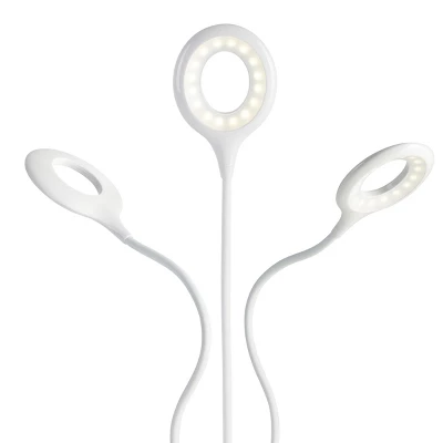 This 3-watt clip-on LED desk lamp is a perfect lamp for the office, dorm room, bedroom, or any place where you need an adjustable brightness light. It uses 16 individual 4000 K neutral white LEDs, rated for 20,000 hours of use and arranged in a 4.3-inch ring, with frosted plastic to diffuse the light. This flicker-free clip-on LED desk lamp can be attached to surfaces up to 1 inch thick or you can simply place the stable 4.7 x 2.6-inch clip-on base on any flat surface. Turning the desk lamp LED on or off and switching between the 3 brightness levels, with up to 240 lumens of brightness, is as simple as touching the button on the base. The 19.3-inch flexible silicone neck allows you to position the light angle for the desired level and focus of illumination. The light is powered using a USB power source (not included) and features a 500mAh rechargeable battery, which can provide up to 3 hours of operation on a 2-3 hour charge. A 59-inch USB Type-A to Micro Type-B cable is included.