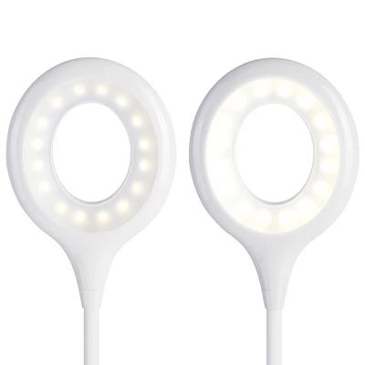 - Bright Table Lamp: This 3-watt LED lamp desk light uses 16 individual 4000 K neutral white LEDs, rated for 20,000 hours of use and arranged in a 4.3-inch ring with frosted plastic to diffuse the light