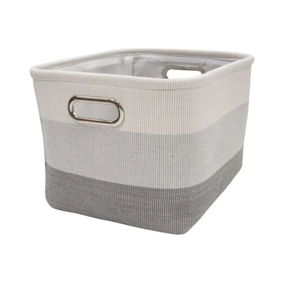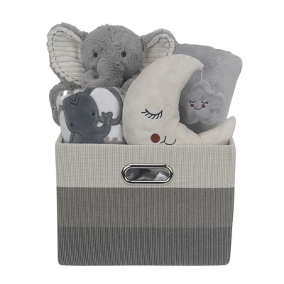 A tisket a tasket, a pretty baby gift basket. This amazing infant gift basket is filled with items mommy, daddy and baby will love. The gift basket arrives wrapped and ready to give with decorative tulle, a Lambs & Ivy Signature ribbon and gift card. Two luxurious blankets are included. One is a soft, warm and cozy striped blanket with a gray elephant appliqué. The 2nd blanket is a soft gray fleece with a crescent moon appliqued in the right corner. Both blankets are 30” X 40”. Jett is a soft furry gray elephant with velour ears and feet. His black eyes are embroidered and there is gray embroidery around his flappy ears. He sits 9 ½“ high. The soft creamy velour moon plush has an embroidered face and has a little embroidered light gray velour star attached. The moon is approximately 9” and the star is 3 ¼”. All these goodies are inside this sturdy ombre gray foldable storage basket. It has two built in silver metal handles for easy carrying and works great in any nursery, playroom or kids’ room. The storage basket measures 12 1/2” X 11” X 9”.
