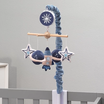 Your little one will love watching this orbiting out of this world musical crib mobile. Constructed with trendy wooden cross arms this baby mobile includes two 4” sized velour embroidered stars, two 3 ½” blue planets with white embroidered stars and tan color rings and a 5” long custom rocket ship in the center. A blue velour scrunchie covers the mobile arm. This mobile plays nursery songs for 20 minutes, has an on/off switch and volume control. It plays Brahms Lullaby, Twinkle Twinkle Little Star and Rock-a-Bye-Baby. Requires 3 AAA batteries not included.