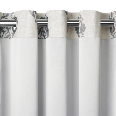 The Navara curtains feature an elegant block print medallion on a linen blend ground. These stylish window panels offer room darkening benefits and a rich texture. 1.65 inch brushed silver grommets are recommended with up to a 1 inch rod for maximum movement. Poly/Linen blend. Sold as a single, lined panel. Easy care, machine washable.