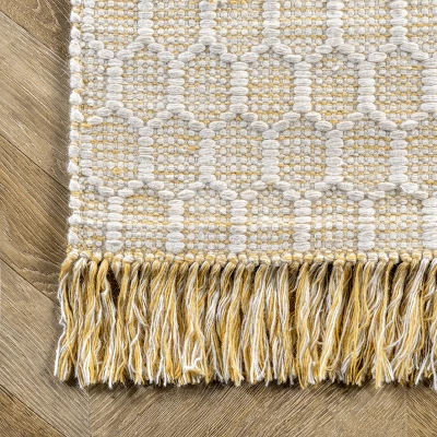 This beautiful unique honeycomb pattern is handmade in India from wool and cotton. The fringe detailing at either end is the perfect touch to complete this simple yet stunning floor covering. Choose from a variety of colorways to best suit your aesthetic. A rug pad is recommended to prevent slipping and to keep the rug lying flat in one place.