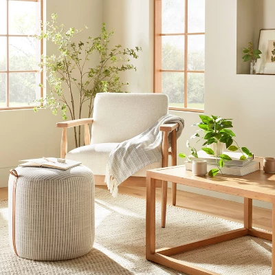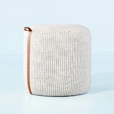 This Round Fabric Ottoman with Faux Leather Trim from Hearth & Hand™ with Magnolia can be used as a footrest or an extra seat. Upholstered in cream and gray striped fabric with a tan faux leather trim detail, it lends chic style that easily coordinates with a range of decor styles. Plus, the fully padded seat offers comfortable seating. Place it in front of your living room couch, armchair or vanity and simply spot clean when required.