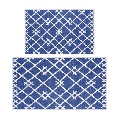 First impressions matter, so give your home indoor floor rugs that are stylishly inviting, protective, and conveniently simple to maintain. The Sussex Home washable kitchen, entryway, and bathroom mat set are designed in a range of timeless patterns in classic colorways to be instantly adored and admired the minute you step inside your home. Safeguard Your Home Floor in StyleOur eye-catching indoor rugs for front doors, kitchen, or laundry room are purpose-designed to protect the floor and safeguard the user against accidental slips caused by water or oil spilled on the floor. Our protective non-slip backed flooring mats not only elevate home decorations but assure maximum safety, security, and comfort. Non-Skid Quality for Versatile UseThese protective non-slip backed flooring mats are made of lightweight, soft, and durable 70% cotton and 30% polyester material, preventing slipping on all floor types. With under 1/4″ in thickness to fit under the doors, our rugs for home are ideal as indoor door entry rugs, laundry mats for laundry room, and kitchen floor mats for in front of sinks. Unique Stylish Patterns for All SurroundingsWith quality materials paired with the latest technology in printing, our non slip area rugs will complement the modern and vintage decor by adding stylish accents and interlaced patterns in bold colors and head-turning prints. Machine Washable for Worry-Free MaintenanceWash at 30°CTumble dry at low temperatureAir dry if needed Product Details:Package Contains: 2 x Modern Low Pile RugsMaterial: 70% Cotton and 30% PolyesterSizes: 44″ L x 24″ W and 31.5″ L x 20″ WThickness: 1/4″