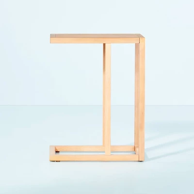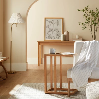 Add a touch of glam and functional style to your living space with this Wood Frame Rectangular C Table from Hearth & Hand™ with Magnolia. The rectangular C-table features a smooth tabletop that pairs perfectly above the flat square base for cohesive appeal, while the beige finish blends easily with any existing decor. The C-shaped design and sleek base allow the table to slide easily under any sofa or couch, keeping essentials close at hand, while the flat tabletop provides a spot to rest beverages, snacks, media essentials and more. Keep this round accent table next to your living room sofa to hold your coffee cup, recent reads or simply a decorative item for display.